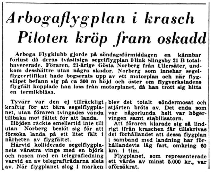 Arbogas Slingsby kraschade   [ sid 3 ]Planet totalhavererade men föraren Gösta Norberg undkom utan skador. |
