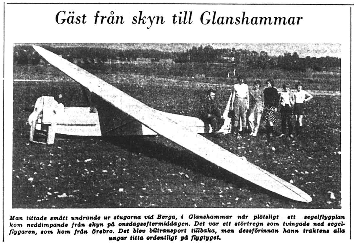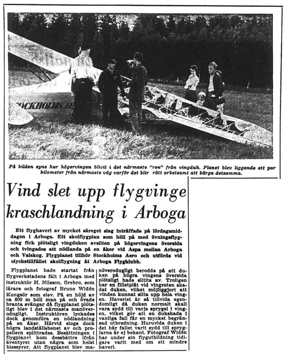 ASA-flygs plan kraschar i Arboga   [ sid 9 ]Flyglärare H Nilsson från Örebro med elev fick nödlanda efter att duken på vingen plötsligt slitits av. (Det var nog Haldo Nilsson som Sven-Olov Sjöstedt har berättat om i "När jag jobbade på ASA-flyg i Örebro". Och planet måste vara Austern SE-ARD.)
