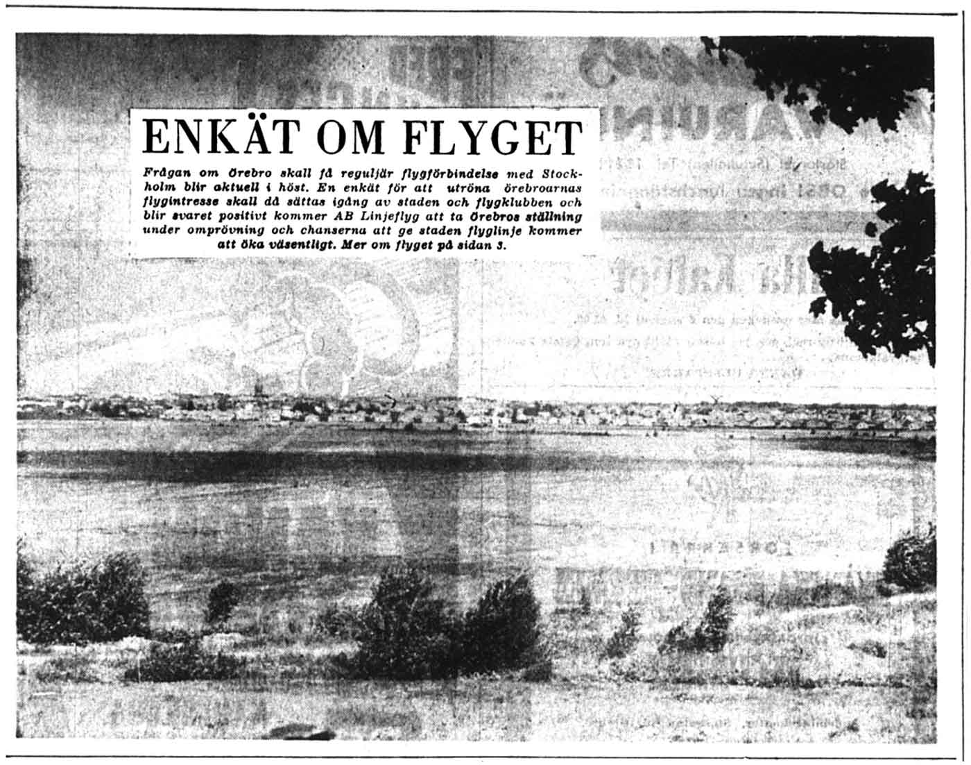 Enkät i höst om behovet av reguljärflyg från Örebro   [ sid 1 , sid 3 ]Örebros framtid som flygstad kommer att avgöras i höst. Linjeflyg kan tänka sig en linje Örebro-Stockholm om det finns tillräckligt intresse. |