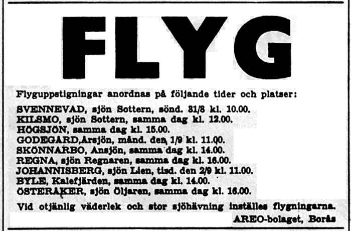 Aerobolaget annonserar rundflyg   [ sid 2 ]Uppstigningar görs från en rad sjöar de närmaste dagarna: Sottern, Årsjön, Ansjön, Regnaren, Lien, Kalefjärden och Öljaren. Rolf Broberg: Arne Tengler var med och startade Aerobolaget 1949, men köpte 1952 loss deras Stinson SE-BCK och startade eget i Örebro. Det sjö-rundflyg som Aerobolaget här bedriver, konkurrerade knappast med Tenglers landbaserade rundflyg som dessutom alltid förlades till Varberg om somrarna. Men rundflygturnéer på sjöar var exakt vad Arne Tengler gjorde med Norseman 1947 i det äldre, Luleåbaserade Norrlandsflyg. Aerobolagets Gunnar Eriksson var för övrigt teknisk chef på Norrlandsflyg vid den tiden. |