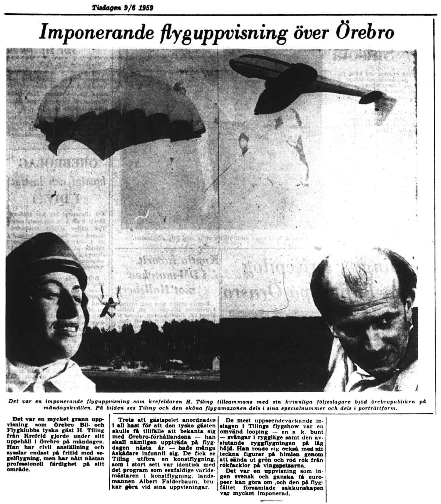 Imponerande flyguppvisning över Örebro igår   [ sid 15 ]Den tyske gästen H Tilling från Krefeld gjorde en imponerande uppvisning i segelflyg på måndagen. Han skulle bara bekanta sig med förhållandena inför en uppvisning nästa år. |