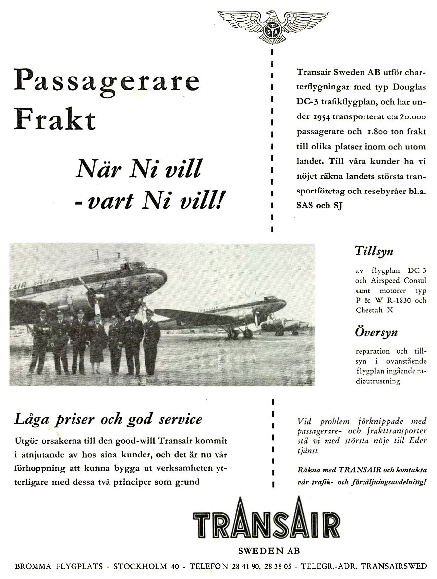 Både Transair-direktören Pelle Lovén och direktör Forsmark i Airtaco tar gärna hand om inrikes passagerarflyg, men vill i så fall ha bort SAS som konkurrenshämmare. Tidningsflyget började redan 1912 då Olle Dahlbeck fög en tur Stockholm – Uppsala åt DN. Men det blev ingen succé, för en bilist som startade samtidigt hann före till Uppsala och stod med i skaran som väntade på Olles ankomst. Aftonbladet gjorde försök med sitt plan "Viking" 1948 som flög till Gävle, Norrköping, Jönköping, Linköping, Falun, Göteborg och Örebro. Men först 1949 bröt tidningsflyget ut på allvar. Ett hoprafs om ca 15 sportmaskiner invaderade Bromma på söndagarna för att flyga ut smålaster med "sportextra". Då ökade efterfrågan på tidigt levererade stockholmstidningar ute i landet. Flygning av tidningar blev en nödvändighet som var reklammässigt bra och dessutom lönsam. Tidningarna ställde allt större krav på flygets lastkapacitet och tillförlitlighet. År 1950 flög man med Junker, Airspeed, Caudron, Norseman och Fokker. Idag har ett fast linjenät spunnits, tidningarna har upptäckt på vilka sträckor det verkligen lönar sig och lärt sig kombinera flyg och bil. Nu flyger Transair Aftonbladet och Expressen med DC-3 och Airspeed Consul. Airtaco flyger mest Expressen men även en del Aftonbladet med Lockheed Lodestar och Lockheed 12. Aero-Nord flyger Aftontidningen med Lodestar och Consul. Varje dag flygs 12 ton skära kvällsdrakar från Bromma, och på lördagar ännu mer. Det mesta är Expressen och Aftonbladet. Aftontidningens upplaga är försvinnande liten. Flygtransport är fyra gånger så dyr som tåg, men man når ett obegränsat spridningsområde före den kritiska tidpunkten kl 16 då tidningarna bör ligga på diskarna. Piloterna är alla mycket erfarna. Här finns hejare som f.d. RAF-officeren Christiernsson (Tefats-Chris, alltså …), Krokstedt, Thorvald Andersson och Hamrin. Ändå har det hänt alltför många olyckor. Visst finns en hets inom kvällspressen, men att anklaga stockholmspressen för att hetsa sina piloter till döds är väl magstarkt. Några säger att landsortspressen är ivrigast att haussa upp haverierna. Och visst, tidningsdöden sveper över Sverige och konkurrensen hårdnar. Flygchefer, piloter och tidningsfolk demeterar resolut allt tal om pressade förhållanden. Men kanske har Aftontidningens distributionschef G. Bodin rätt när han anser att det givetvis blir en psykologisk press på piloterna. De vill inte vara sämre än någon annan och pressar sig därför själv omedvetet till att flyga även när det inte är lämpligt.