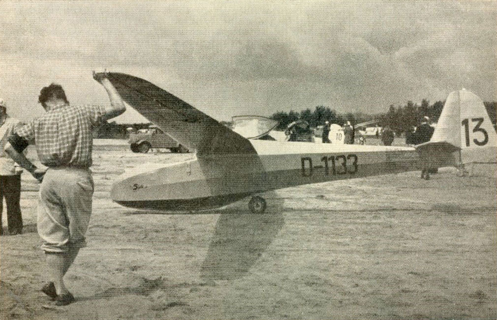 Scheibe Spatz är ett litet lätt övnings- och prestationssegelflygplan från 1952 som håller på att bli populärt i Tyskland. Flera exemplar deltog i de tyska mästerskapen 1953. Planet är snällt, billigt, har stålrörskropp och kan köpas färdigt eller i byggsats. Det är inte tillåtet för avancerad flygning. En högvärdig version av planet med 2 m längre vingar finns också. Dess prestanda påstås i vissa avseenden vara i nivå med Weihe. (Här avses troligen L-Spatz, där L = Leistung = prestanda) (sid 27) Skövde Flygklubb vill köpa en Spatz från Tyskland. Denna typ är ny i Sverige och ännu inte godkänd. Ett godkännande krävs innan det kan användas i klubbens verksamhet. Klubben har komntaktat LFS och KSAK för att undersöka möjligheten att få den godkänd. Rolf Broberg: Enligt civilregistret köpte Skövde en L-Spatz SE-SPW i slutet av 1954, vilket var den första svenska Spatzen. Örebro fk skaffade en L-Spatz SE-SWF i jul 1958 men sålde den i jan 1961. Då hade man fått blodad tand på K 8 och Ka 6. |