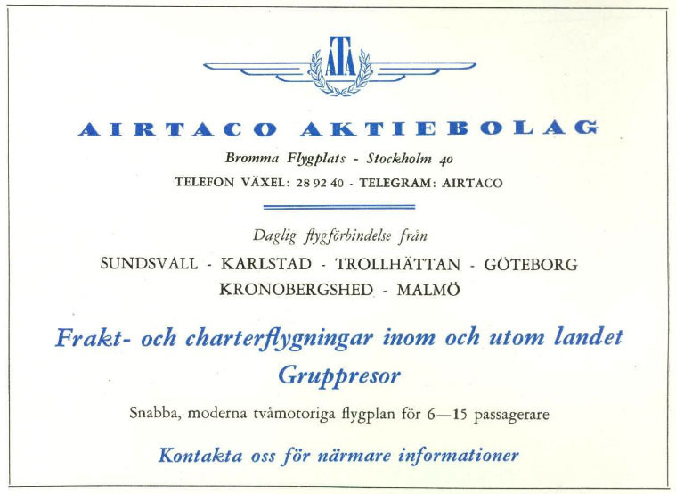 - Tidningsflyg "drakflykt"(sid 12-15) En förändring av tidningsflygbranschens arbetsformer är trolig och kan vara nära förestående. Av de svenska tidningsflygarnas från början ganska sportmässiga flängande kring riket med sina laster av skära "drakar" kan komma att uppstå ett svenskt inrikesflyg. Med all aktning för SAS måste man väl ändå säga att ett sådant egentligen saknas idag. Direktör Holmström i AB Aero-Nord säger att "Vi kommer att flyga så länge det lönar sig". Airtaco-chefen, direktör Forsmark menar att: "Det pågår en utätningsprocedur i branschen f.n. Det går mot ett bolag…". De tre kvällstidnignarna i Stockholm kommer säkert att se till att det lönar sig för dessa bolag och för den tredje spelaren Transair. För vilken distributionschef skulle våga sluta flyga sina tidningar och lämna fältet öppet för konkurrenterna? Att tidningarnas intresse i flygbranschen är ganska påtvingat har en distributionschef berättat för oss. Flygbolagen kan dock inte slå sig till ro med enbart tidningsdistribution. Planen går fullastade med tidningar, men flyger tomma på återresan. De behöver kompletterande uppgifter såsom lämpliga returfrakter. Transair satsar tydligt på passagerarflyg. Men Aero-Nord flyger 70 % utlandscharter över hela världen och 30 % tidningsflyg och är inte särskilt pigga på att börja med passagerarflyg. De menar att tidningsflyget är olämpligt för passagerartrafik eftersom det bara fungerar i ena riktningen. Airtaco med mäktiga DN bak ryggen flyger tidningar till 95 % men säger förstås inte nej till en returfrakt. |
