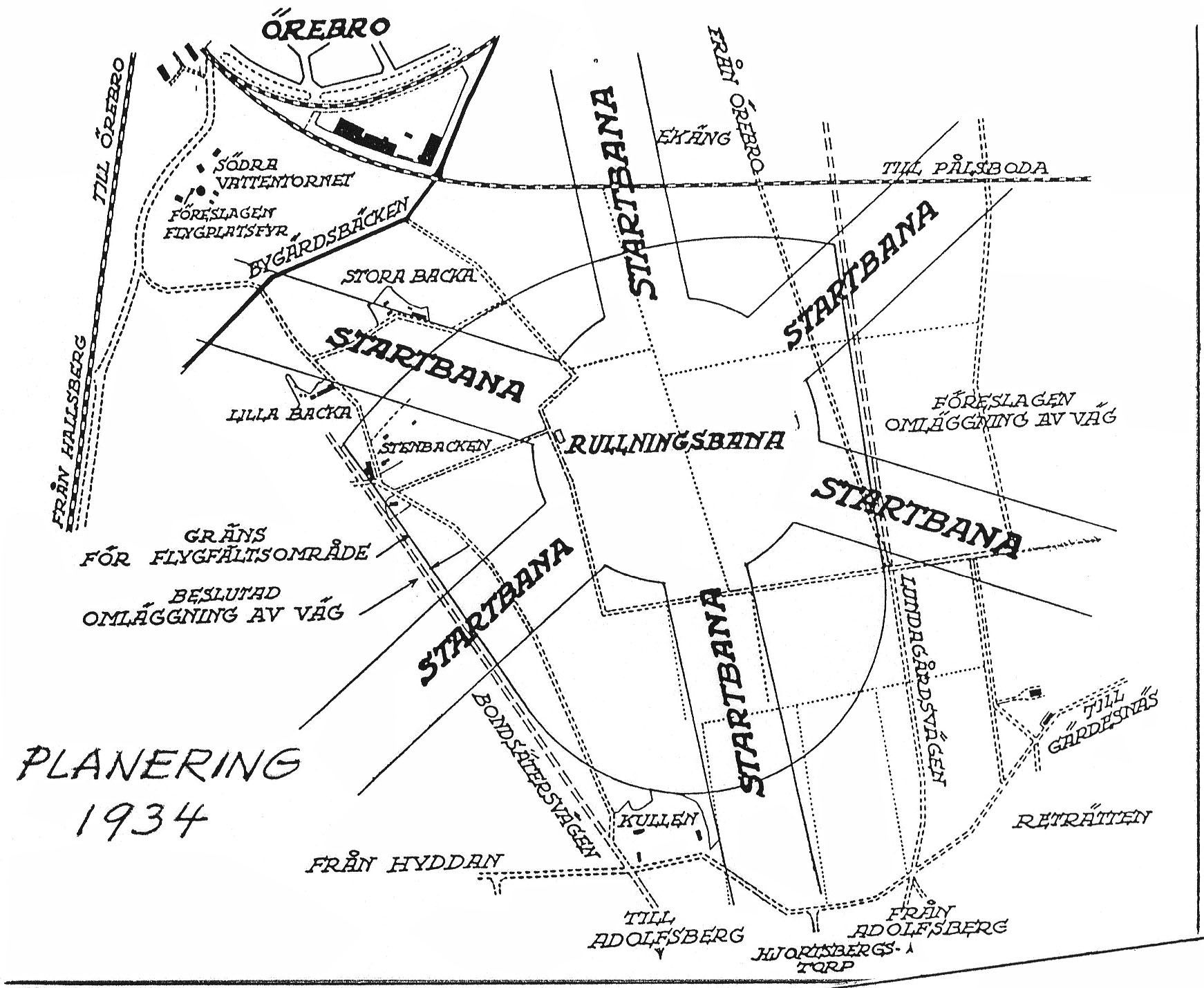 Planering av nytt flygfält i Gustavsvik   [ karta ]Idéritning för nytt flygfält. Befintliga vägar och några hus visas. En planerad ny och rak Bondsättersväg är inritad. Via Arne Svensson. |