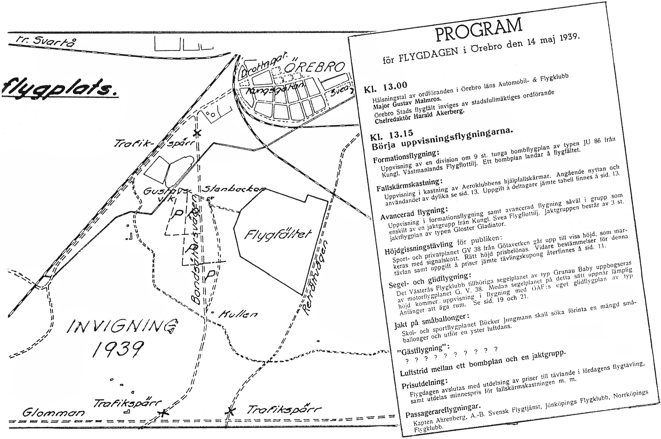 Gustavsviksfältet, orienteringskarta för flyguppvisningen   [ karta ]Avspärrningar, parkeringar, vägar, hus mm samt flygdagsprogram. Via Arne Svensson. |