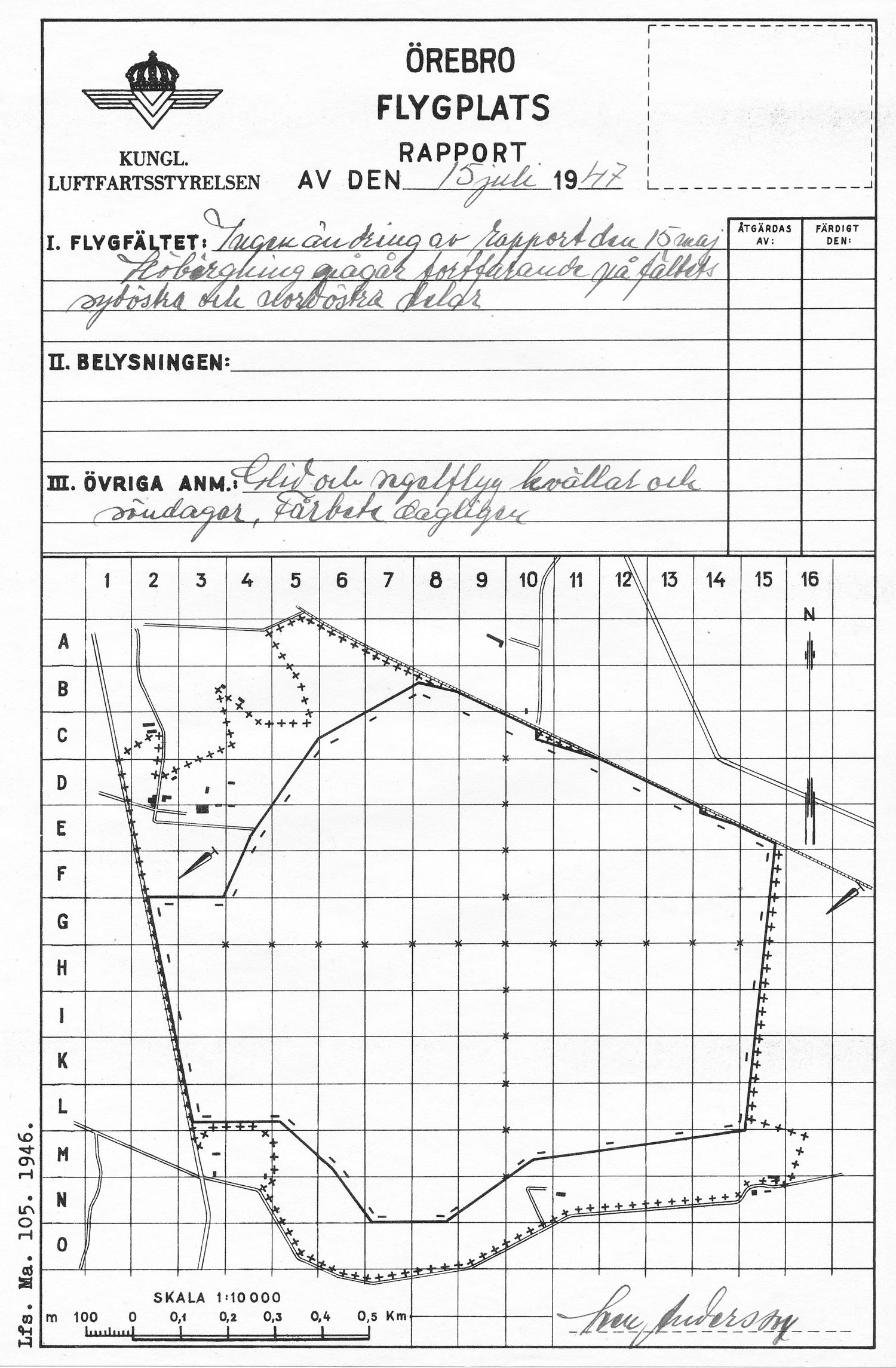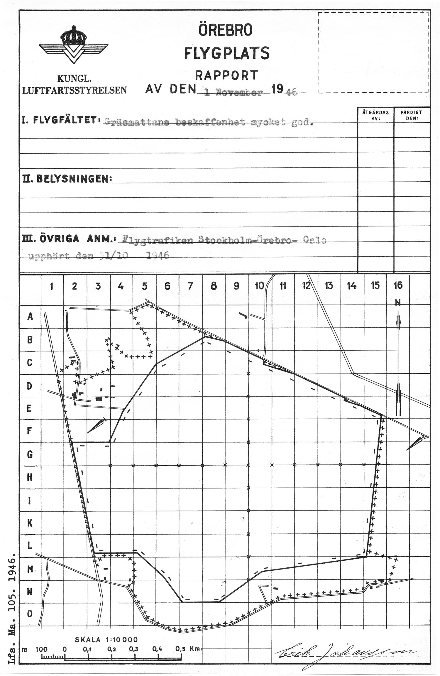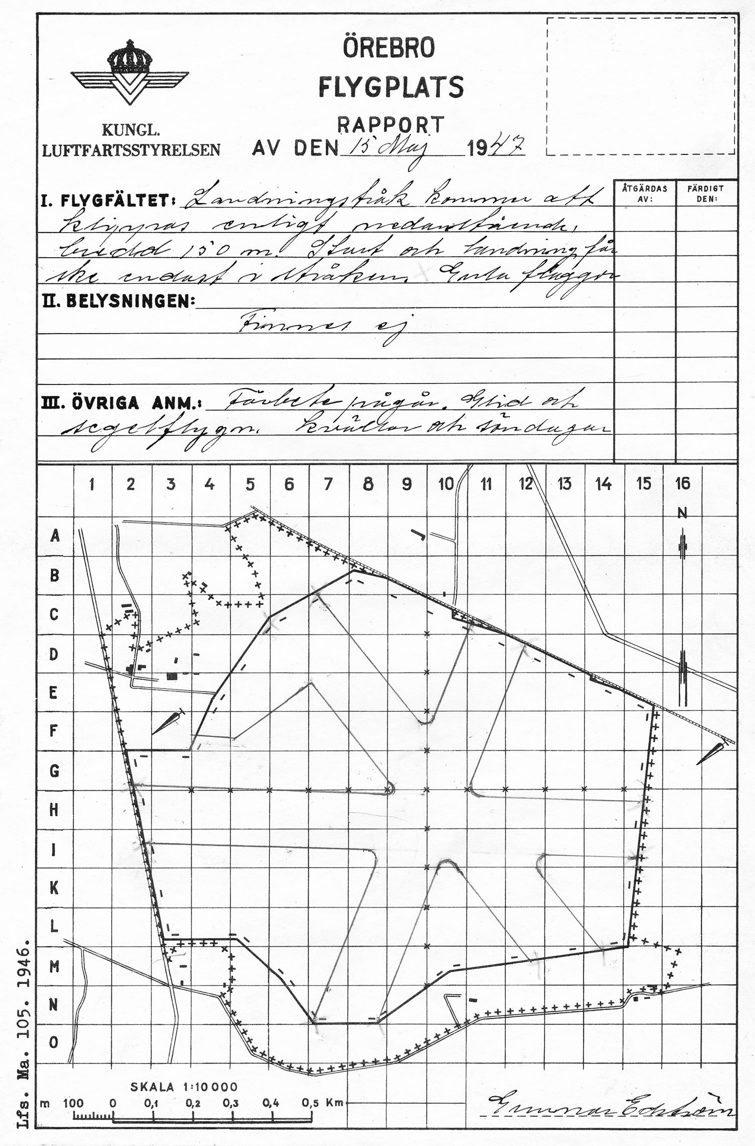Gustavsviksfältet, flygplatsrapport på ny karta från LFS   [ karta ]Första rapporten på LFS flygfältskarta från 1946. Via Örebro Stadsarkiv. |