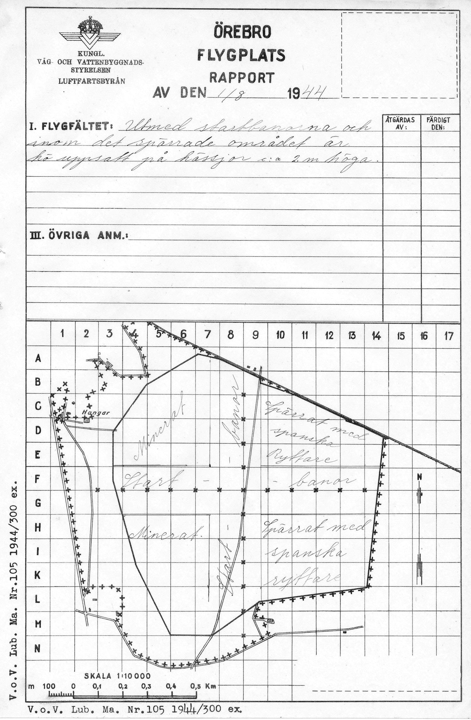 Gustavsviksfältet, flygplatsrapport om mineringar   [ karta ]Rapport på Väg- och vattenbyggnadsstyrelsens flygfältskarta från 1944: Minerade områden, spärrade områden och två sparade landningsbanor. Via Örebro Stadsarkiv. |