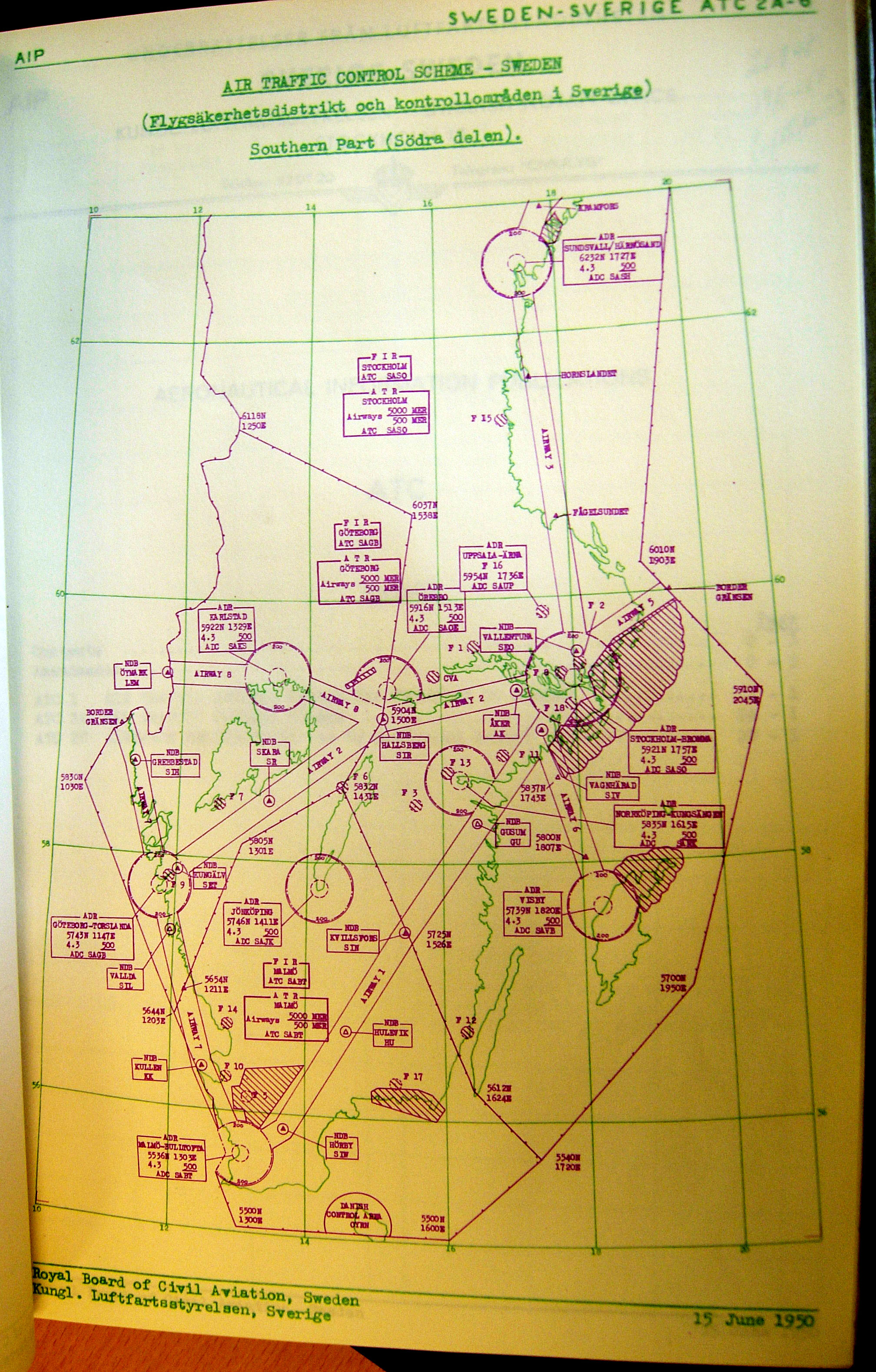 Kontrollområden från Malmö till Sundsvall   [ karta ]LFS AIP: "Plan över flygtrafikledningen i Sverige, södra delen". Via Riksarkivet. |