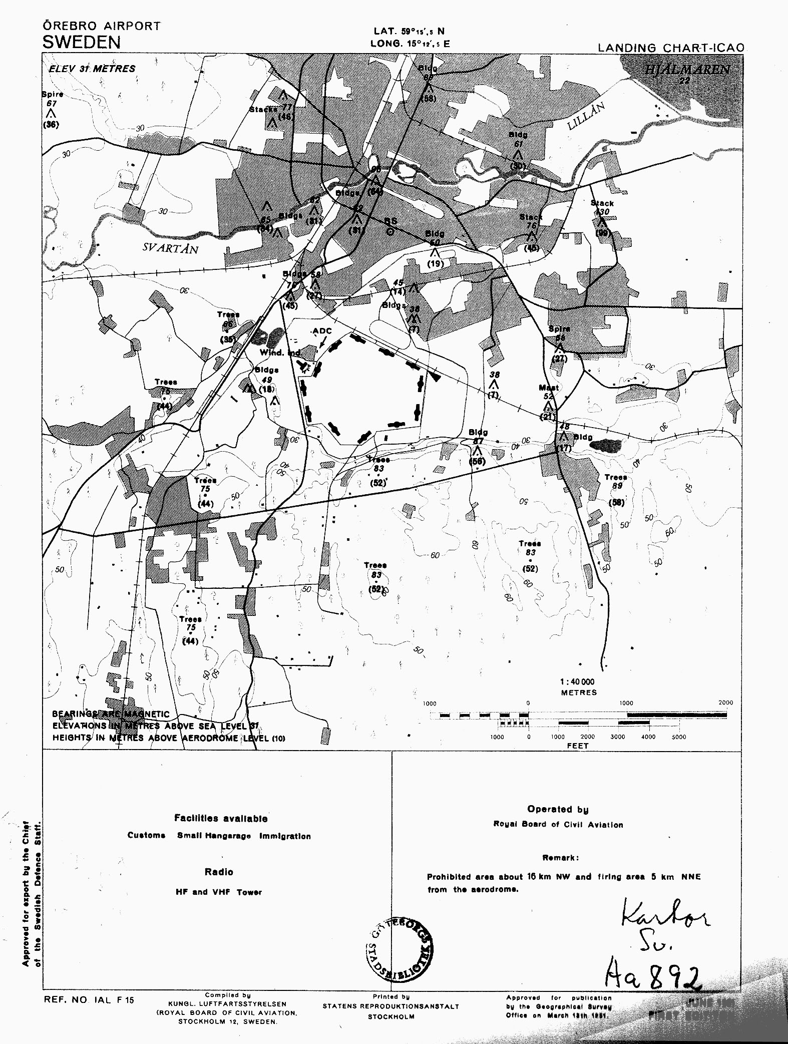 Landningskarta för Gustavsvik   [ svartvit | färg ]Landing chart. Via Universitetsbiblioteket i Göteborg. Sven-Erik Davidsson: Beteckningen ADC, som bl.a. anges vid tornet i Örebro, betyder Aerodrome Control. Några år senare skrev man istället TWR. |