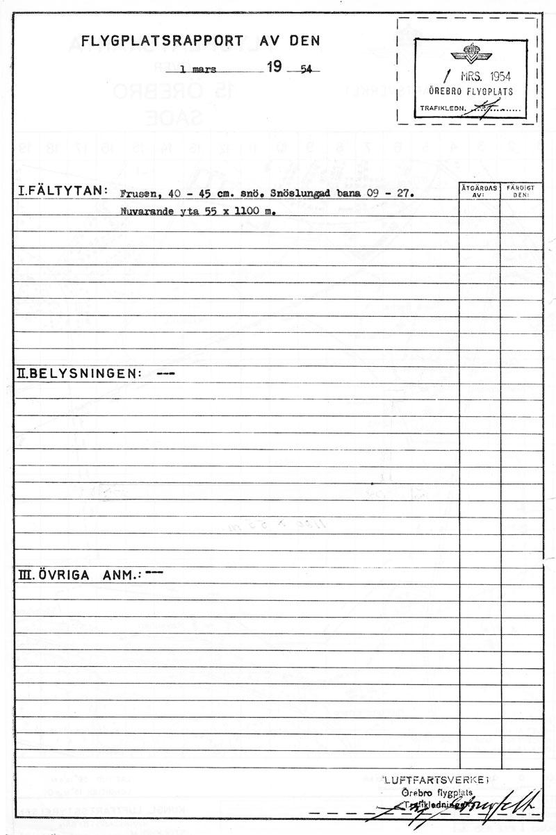 Gustavsviksfältet, flygplatsrapport av Stig Stornfelt   [ karta | text ]Rapport på LFV flygfältskarta från 1949. Första rapporten jag hittat som är undertecknad av Stig Stornfelt. Snöslungad bana. Via Örebro Stadsarkiv. |
