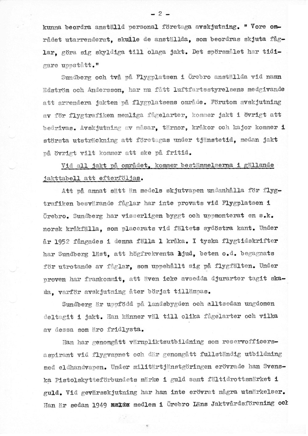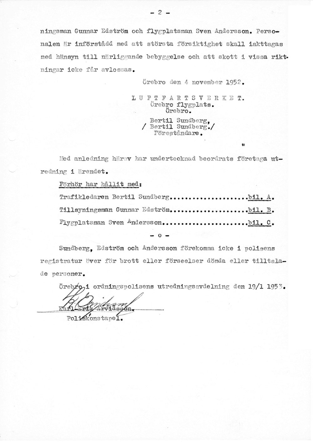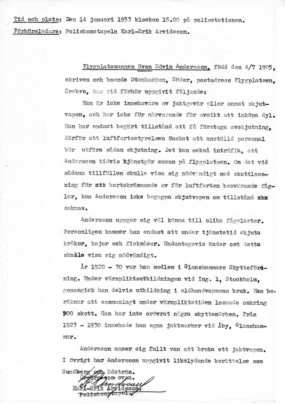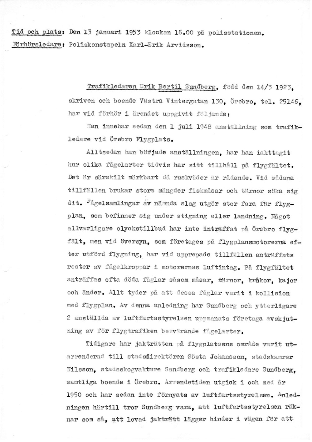 Polisen förhör flygplatspersonalen   [ sid 1 | sid 2 | sid 3 | sid 4 | sid 5 | sid 6 | sid 7 | sid 8 ]Förhör med trafikledare Bertil Sundberg, tillsyningsman Gunnar Edström och flygplatsman Sven Andersson pga ansökan om att skjuta för luftfarten farliga fåglar på flygfältet. Hela namn och födelsedata anges för alla tre. |