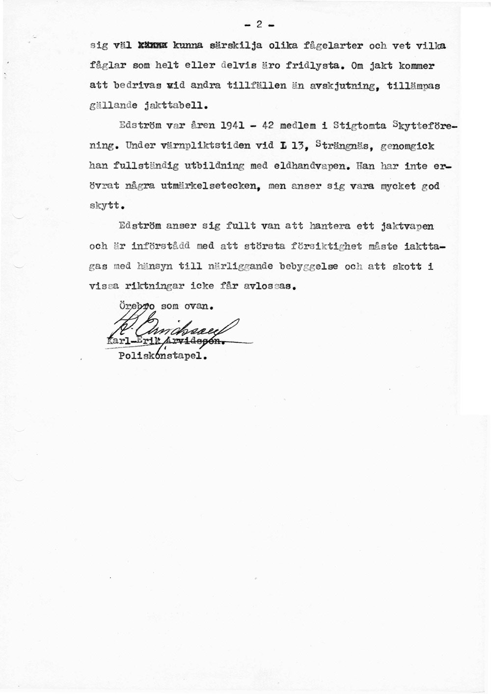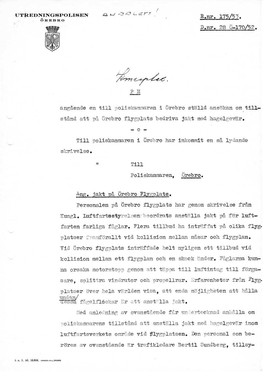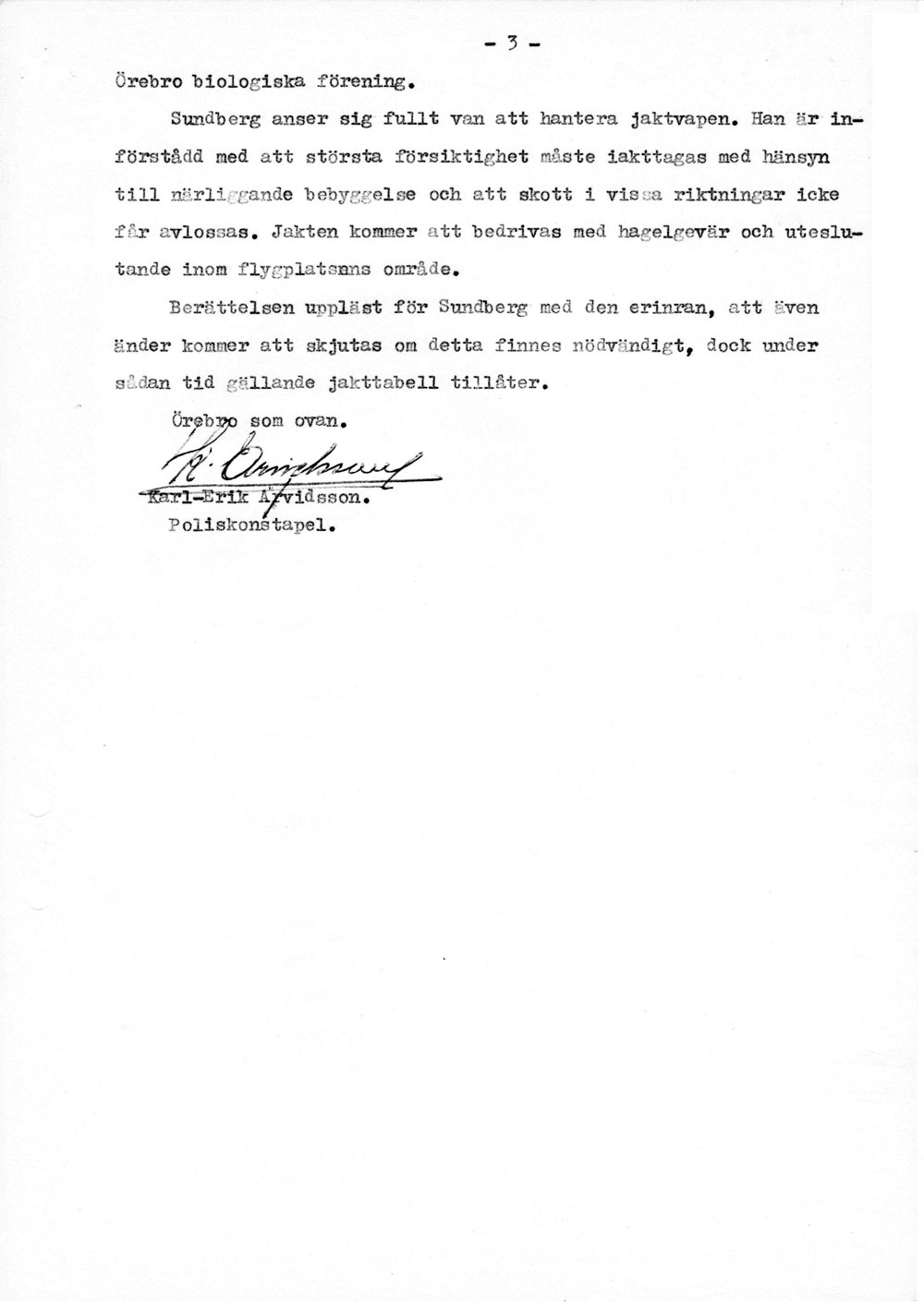 Polisen förhör flygplatspersonalen   [ sid 1 | sid 2 | sid 3 | sid 4 | sid 5 | sid 6 | sid 7 | sid 8 ]Förhör med trafikledare Bertil Sundberg, tillsyningsman Gunnar Edström och flygplatsman Sven Andersson pga ansökan om att skjuta för luftfarten farliga fåglar på flygfältet. Hela namn och födelsedata anges för alla tre. |