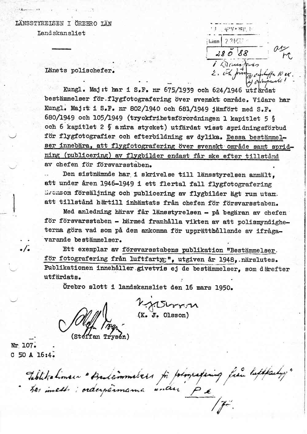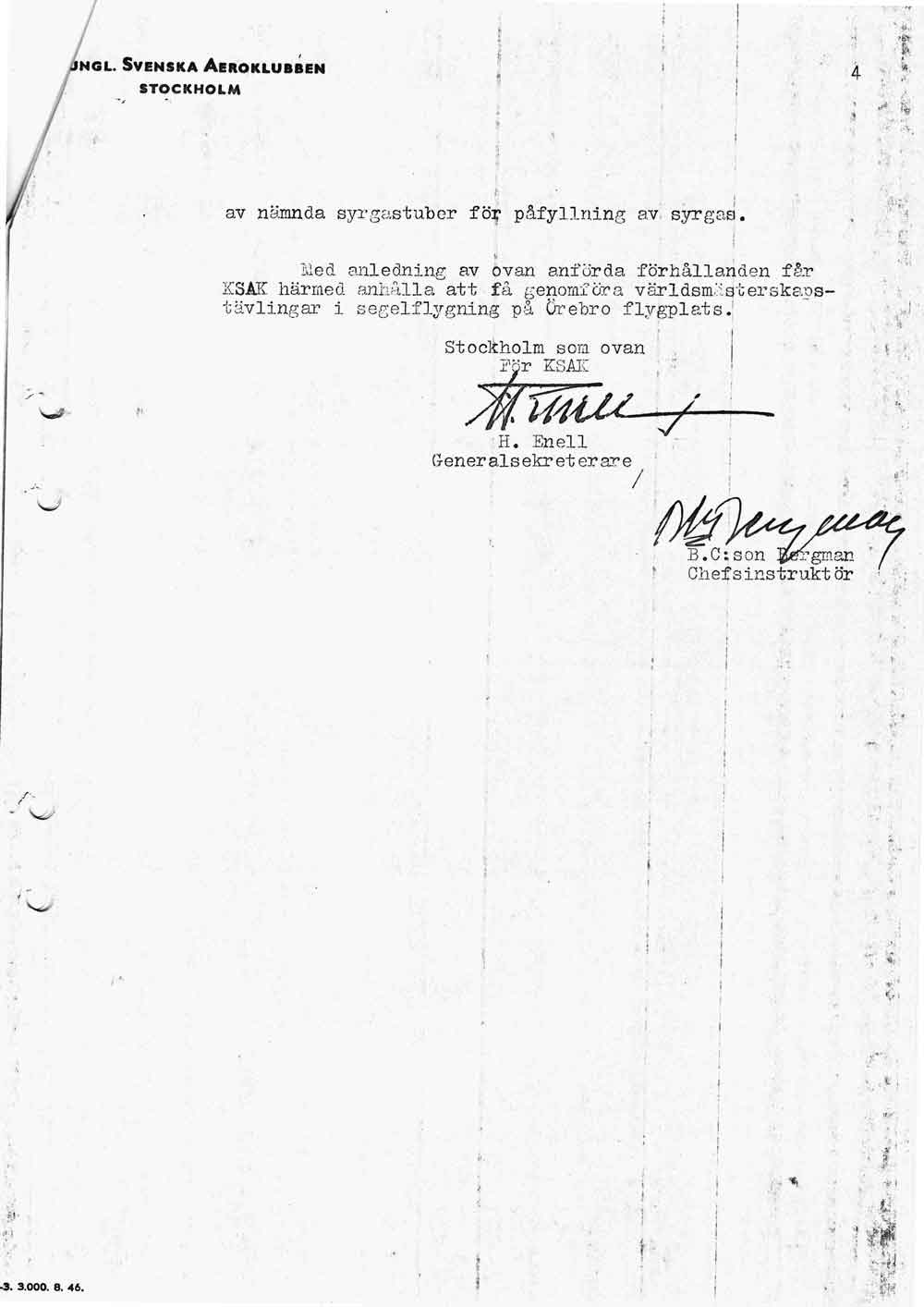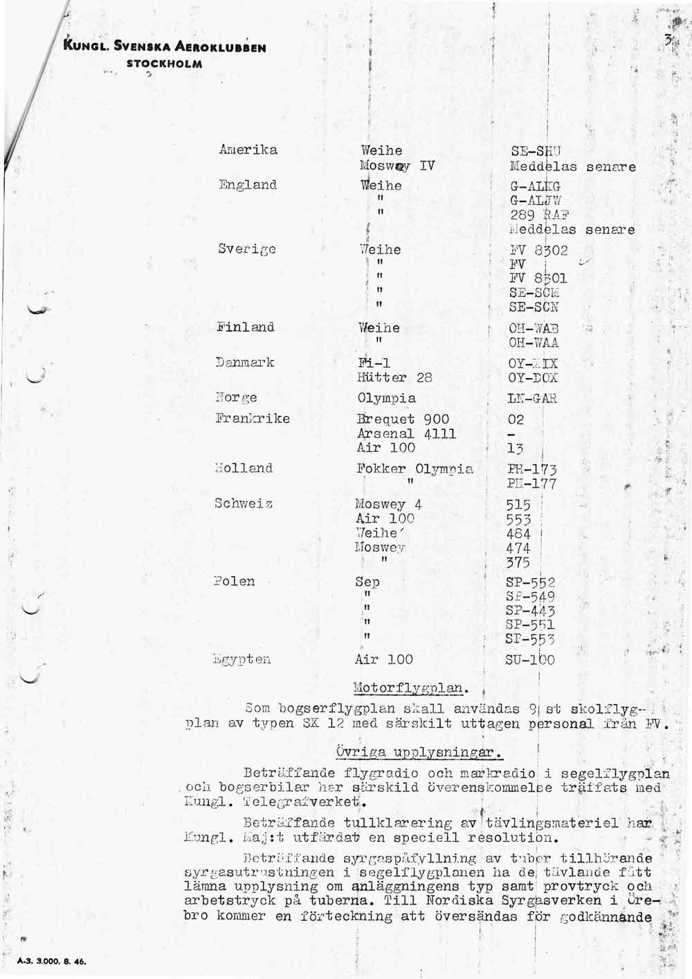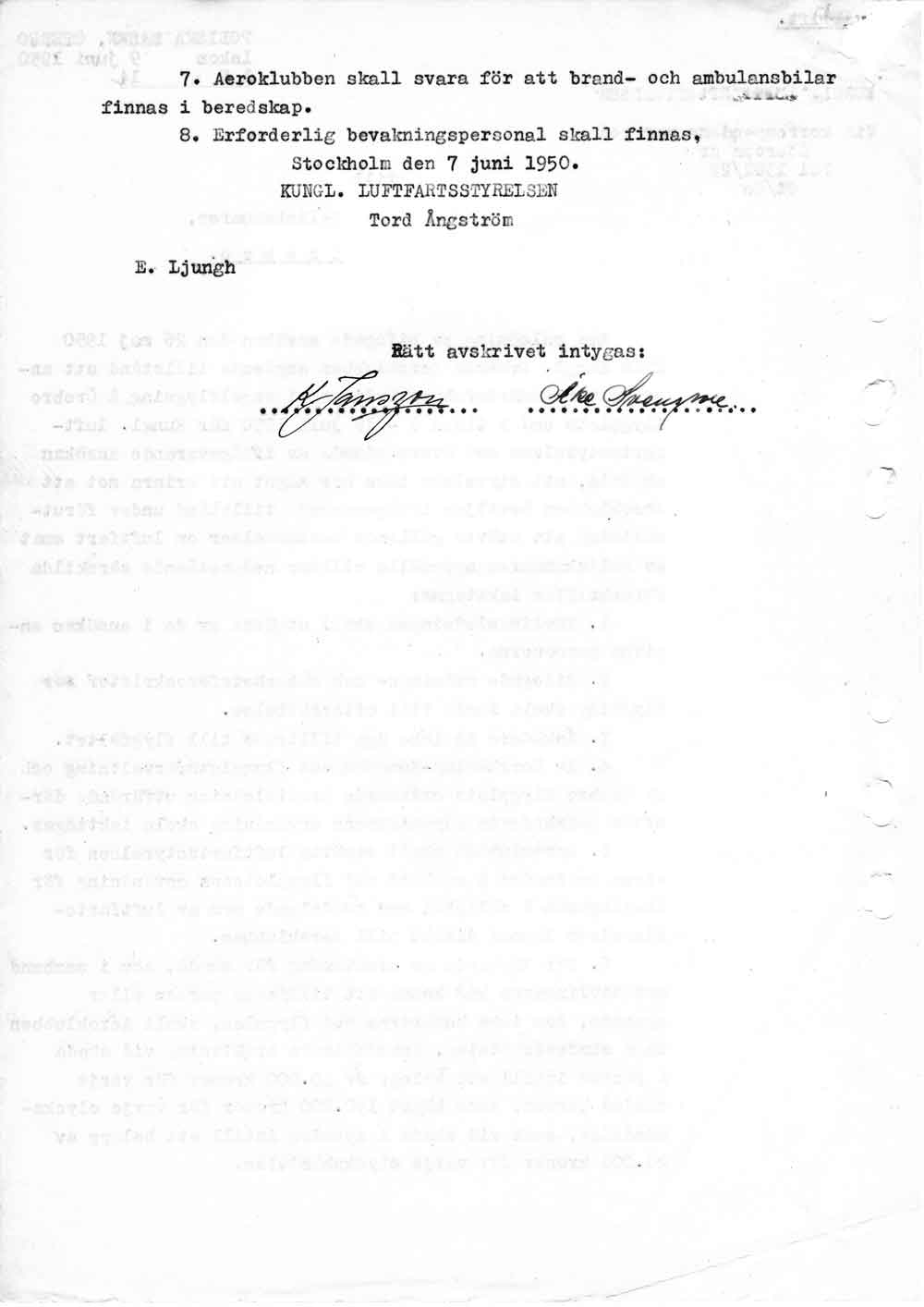 Polisen förhör flygplatspersonalen   [ sid 1 | sid 2 | sid 3 | sid 4 | sid 5 | sid 6 | sid 7 | sid 8 ]Förhör med trafikledare Bertil Sundberg, tillsyningsman Gunnar Edström och flygplatsman Sven Andersson pga ansökan om att skjuta för luftfarten farliga fåglar på flygfältet. Hela namn och födelsedata anges för alla tre. |