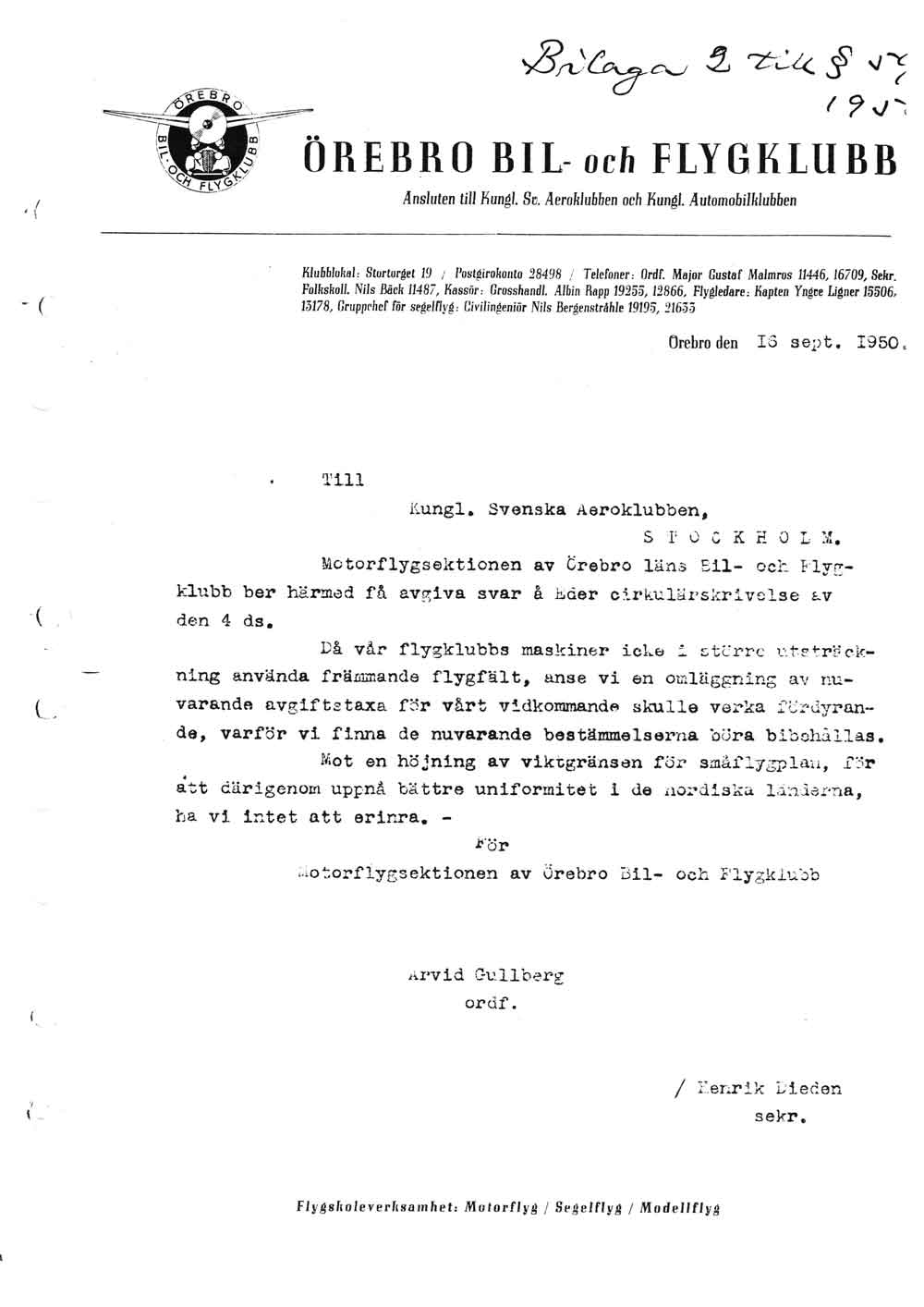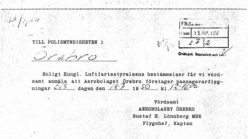 Rundflyg 18 juli – "Aerobolaget Örebro" ber polisen om tillstånd   [ sid 1 ]Rolf Broberg: Flygchefen och kaptenen Gustaf H Lönnberg med sitt "Aerobolaget Örebro" är för mig en okänd stjärna på Örebrohimlen. Vi vet dock att det betydligt mer kända Aerobolaget i Borås rundflög vid VM i Örebro som avslutades samma dag som denna ansökan är daterad. |