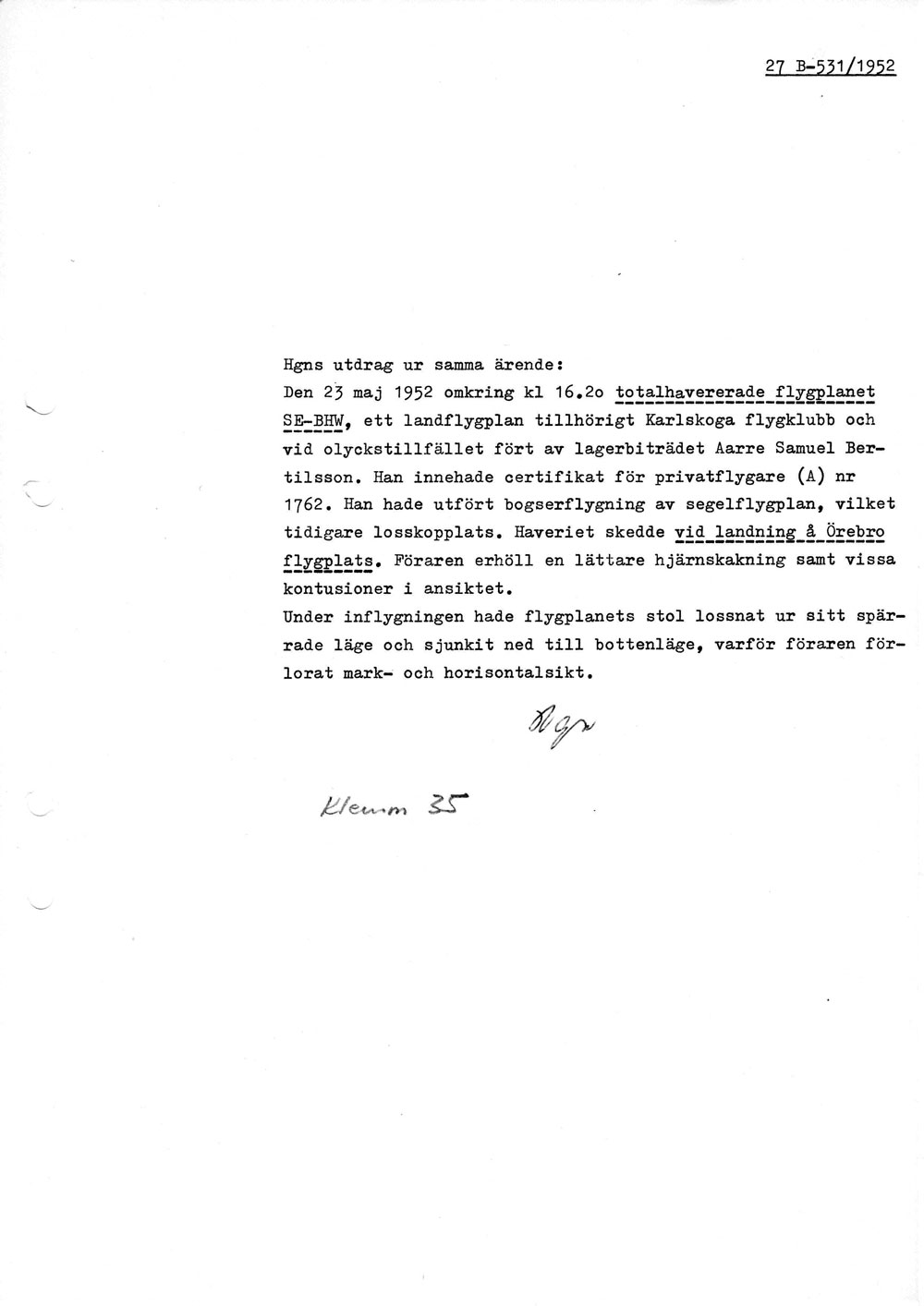 Rapport om haveriet med SE-BHW den 23/5   [ sid 1 ]Källan framgår inte, bara att signatur Hgn signerat den. Är det en polisrapport? |