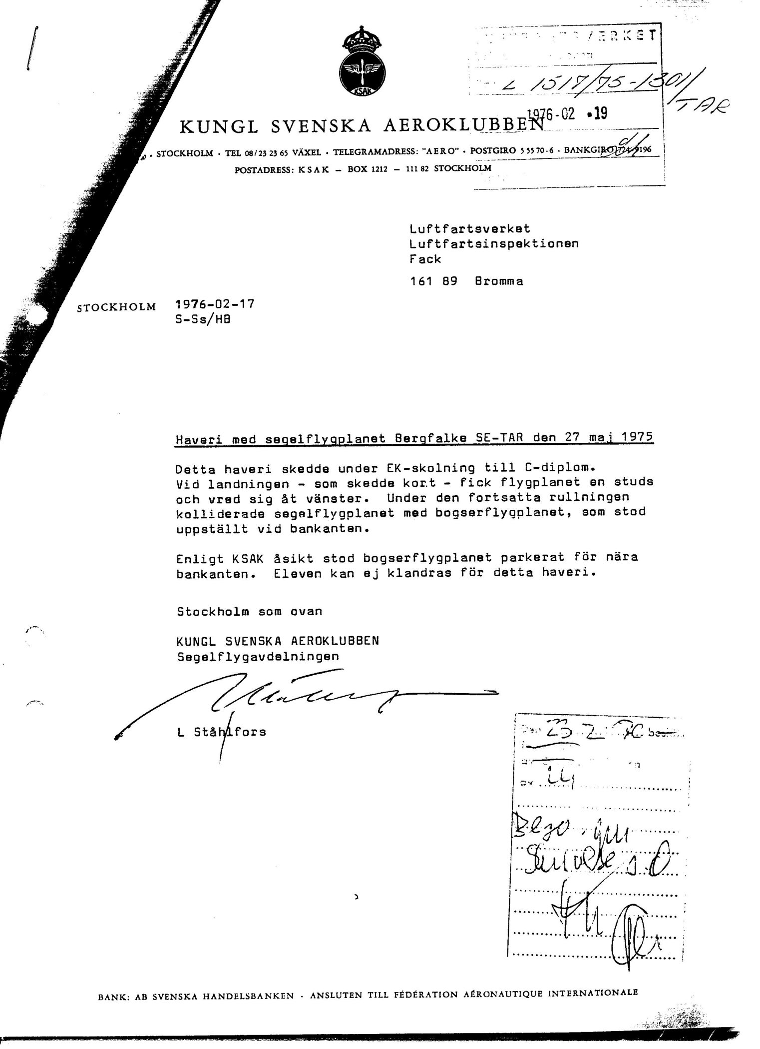 Haveri med segelflygplanet Bergfalke SE-TAR den 27 maj 1975 – KSAK   [ sid 1 ]Rolf Broberg: KSAK kommenterar kollisionen på Gustavsviksfältets startbana mellan den landande Bergfalken SE-TAR och det vid bankanten uppställda bogserplanet, MFI Trainer SE-ENG. Bägge planen tillhörde Örebro Segelflygklubb. Ingen människa kom till skada vid olyckan. Bergfalkens yttersta vingspets fick en skada som reparerades. MFI:ns glashuv spräcktes och vänster vingspets fick ett slag som gjorde planet lite skevt. |