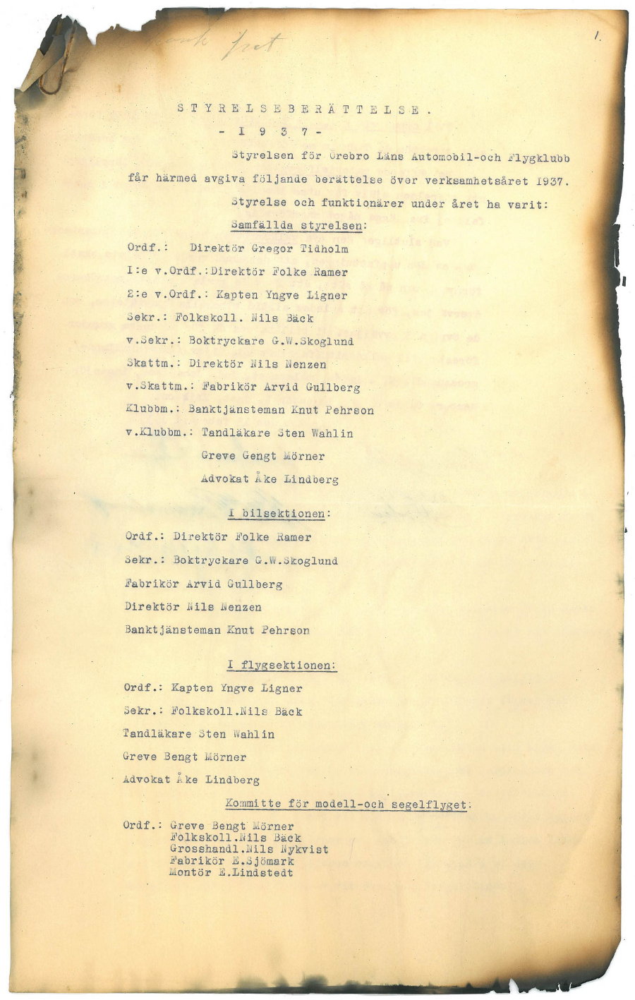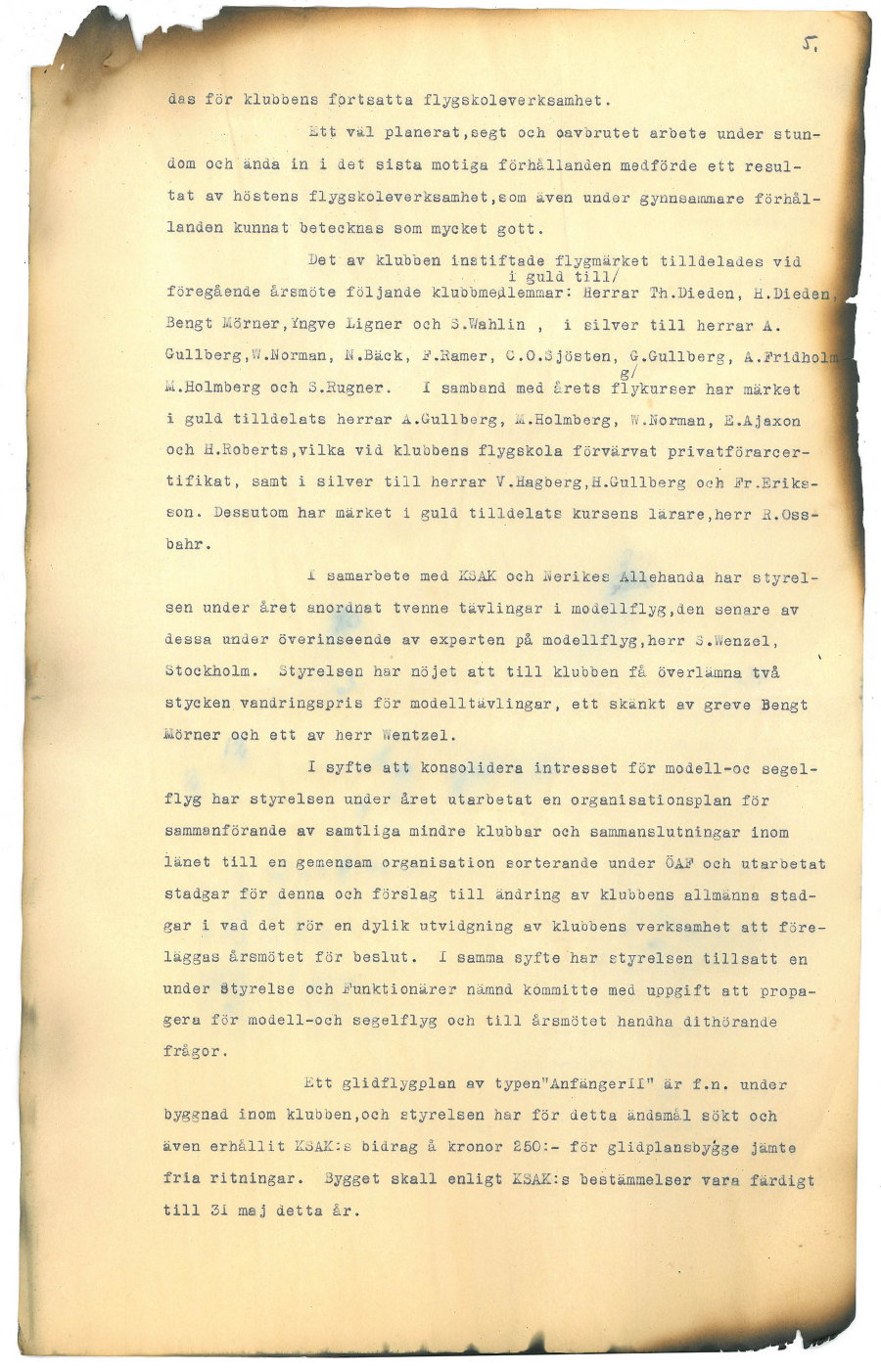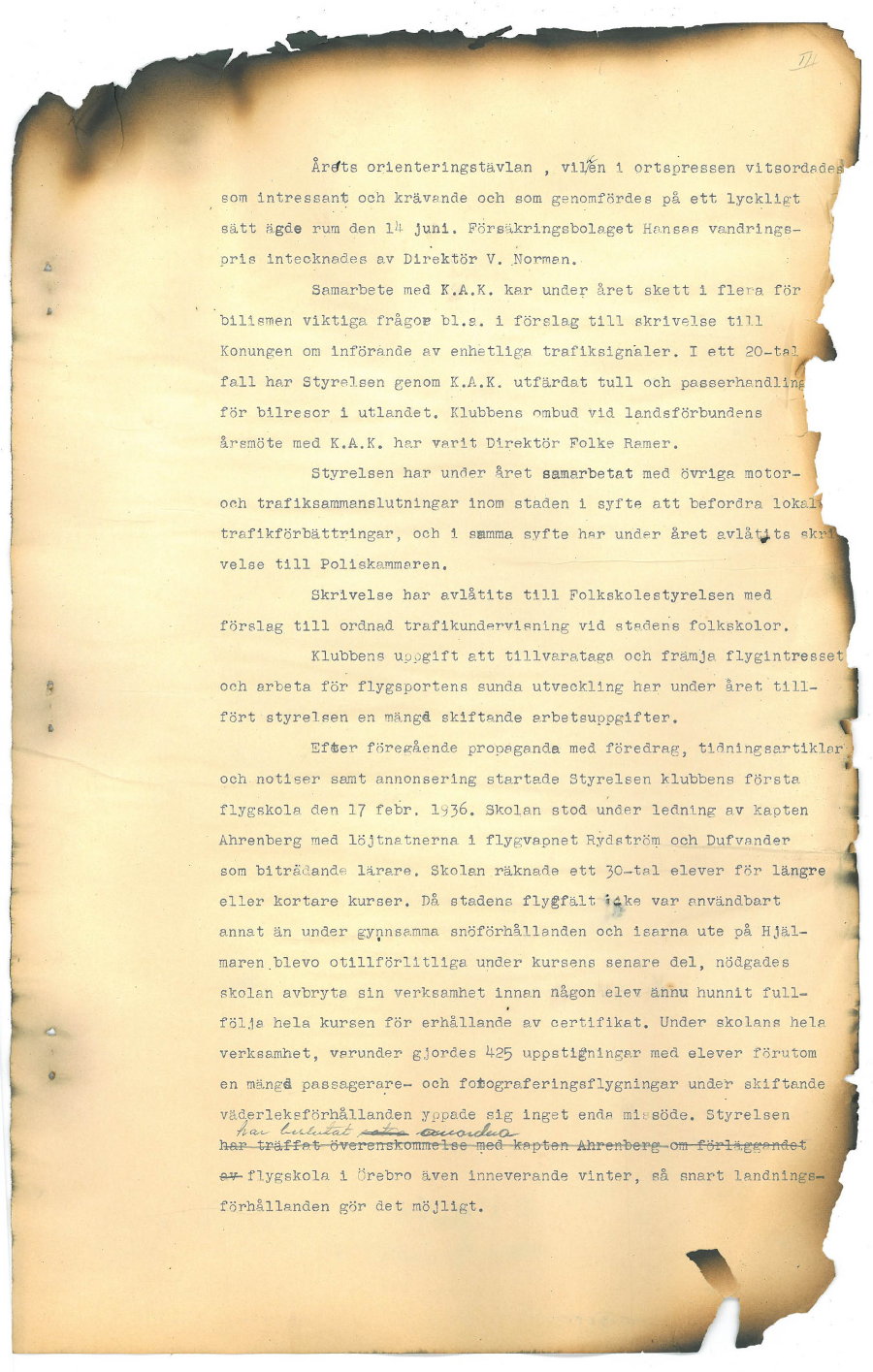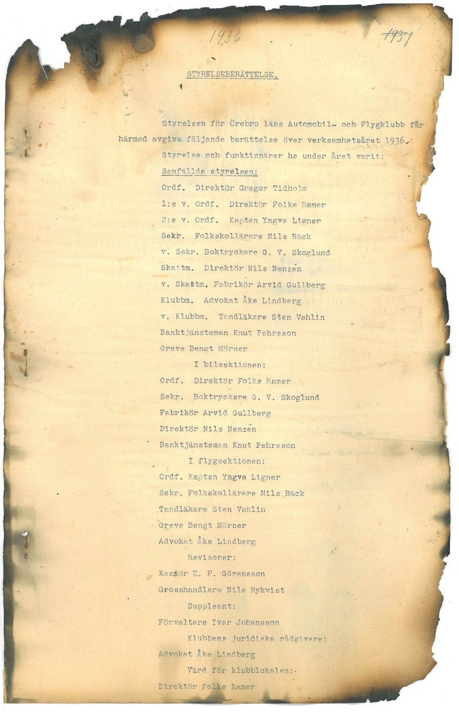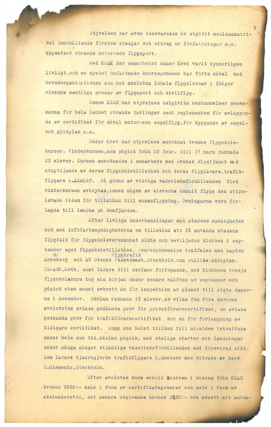 Dessa dokument har en gång räddats ur flygklubbens brinnande bygglokal. Brandskadorna förminskar knappast det historiska intrycket, se t.ex. flygverksamhetens startår 1936.