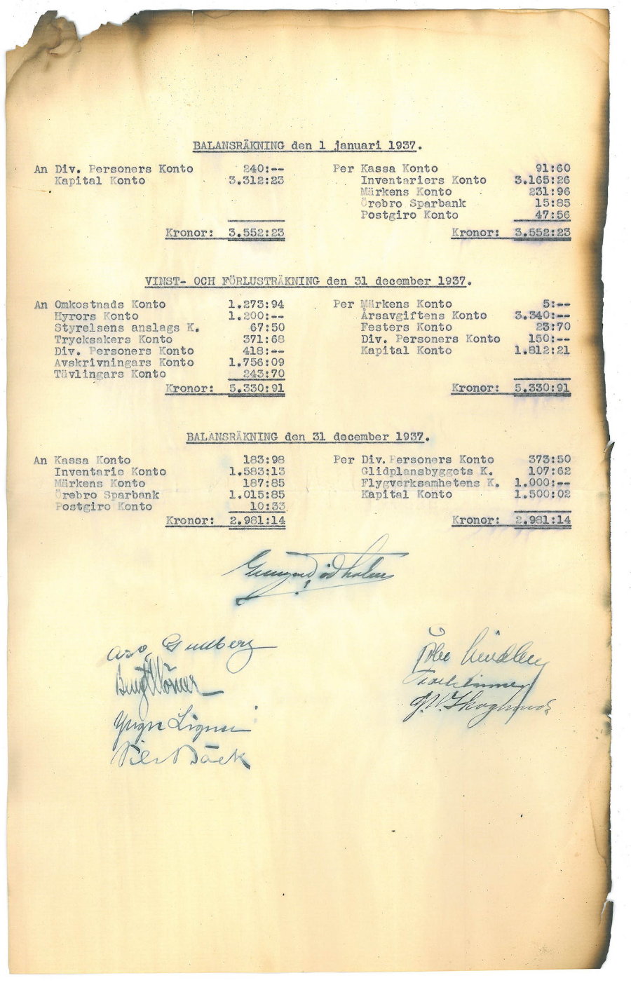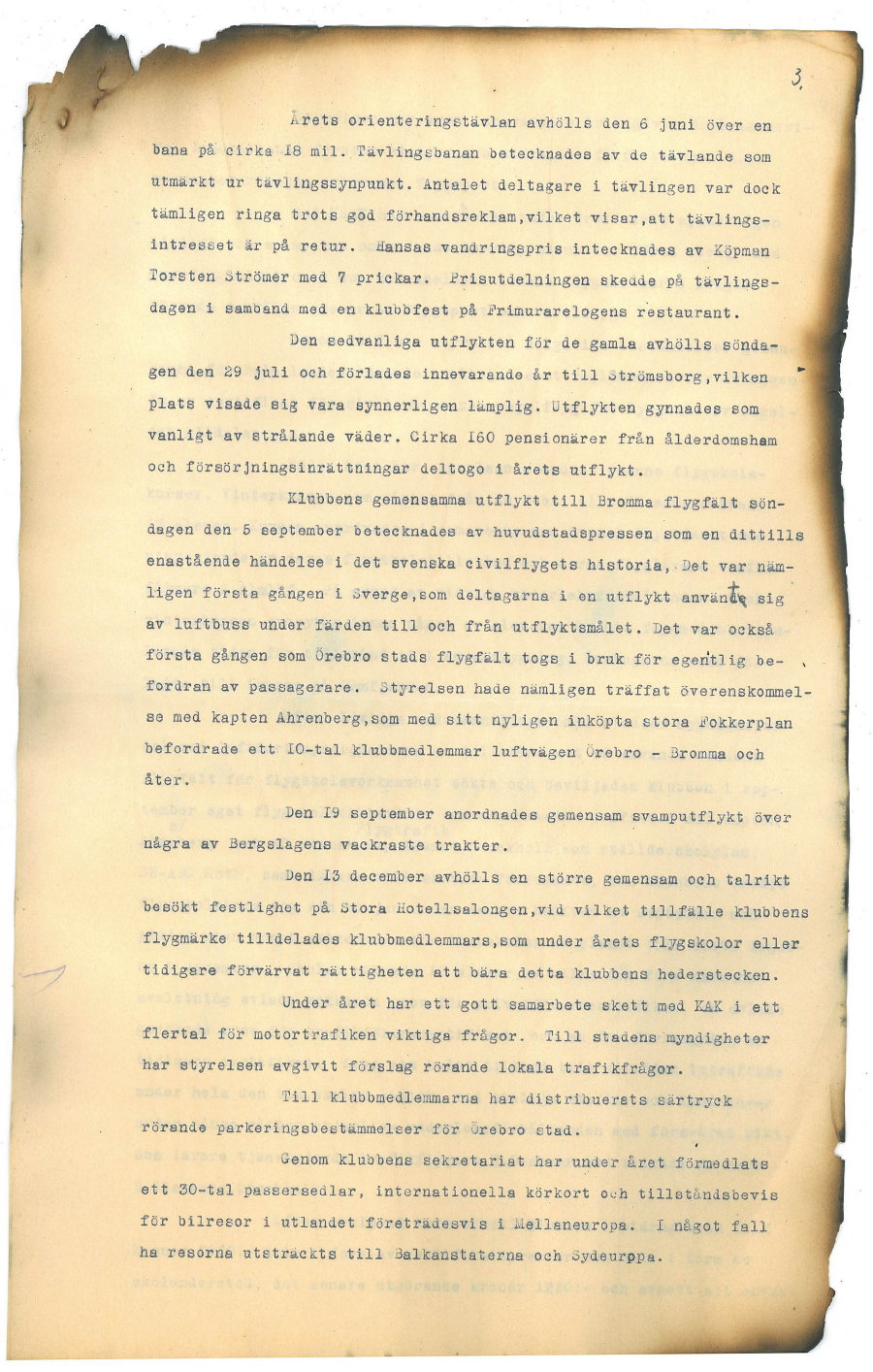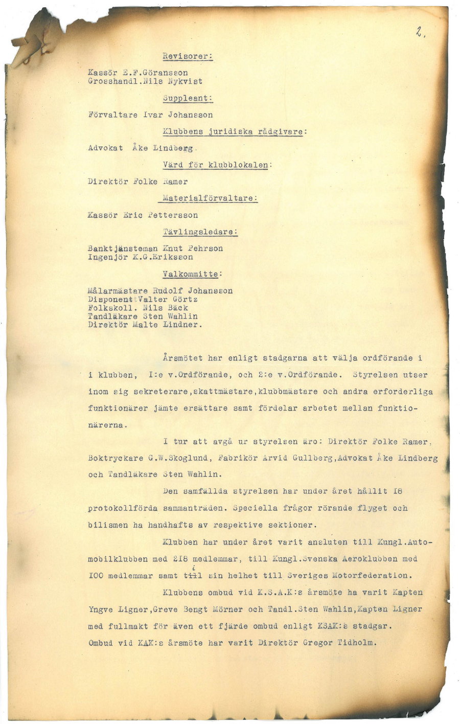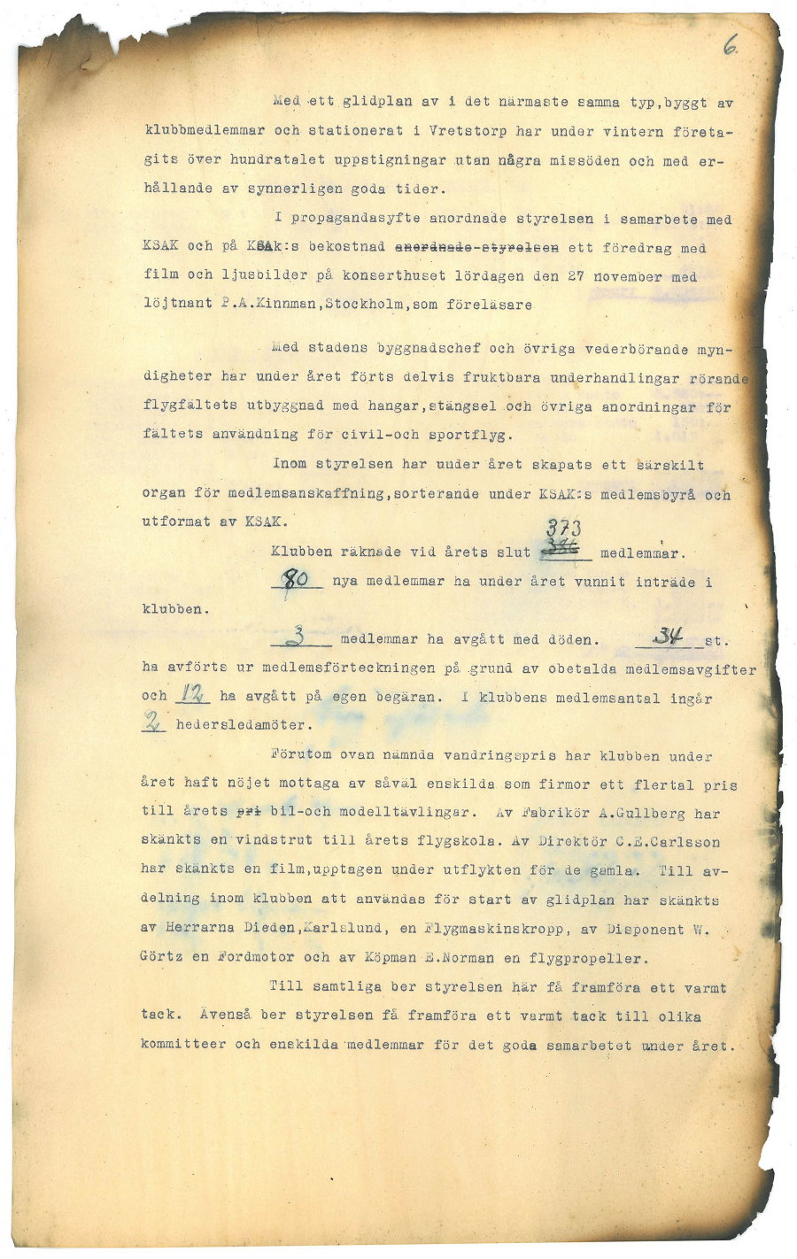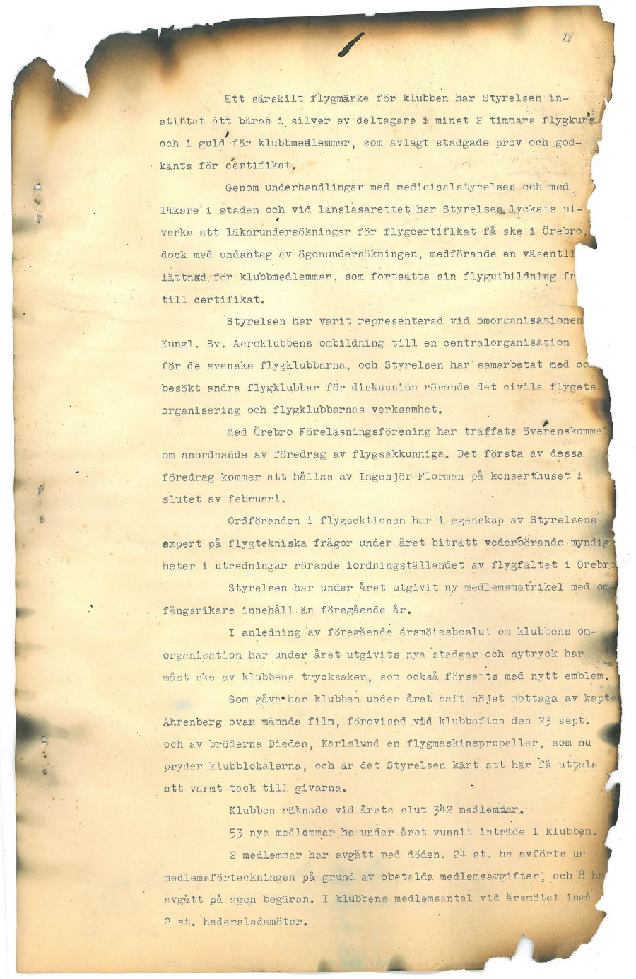 Dessa dokument har en gång räddats ur flygklubbens brinnande bygglokal. Brandskadorna förminskar knappast det historiska intrycket, se t.ex. flygverksamhetens startår 1936.
