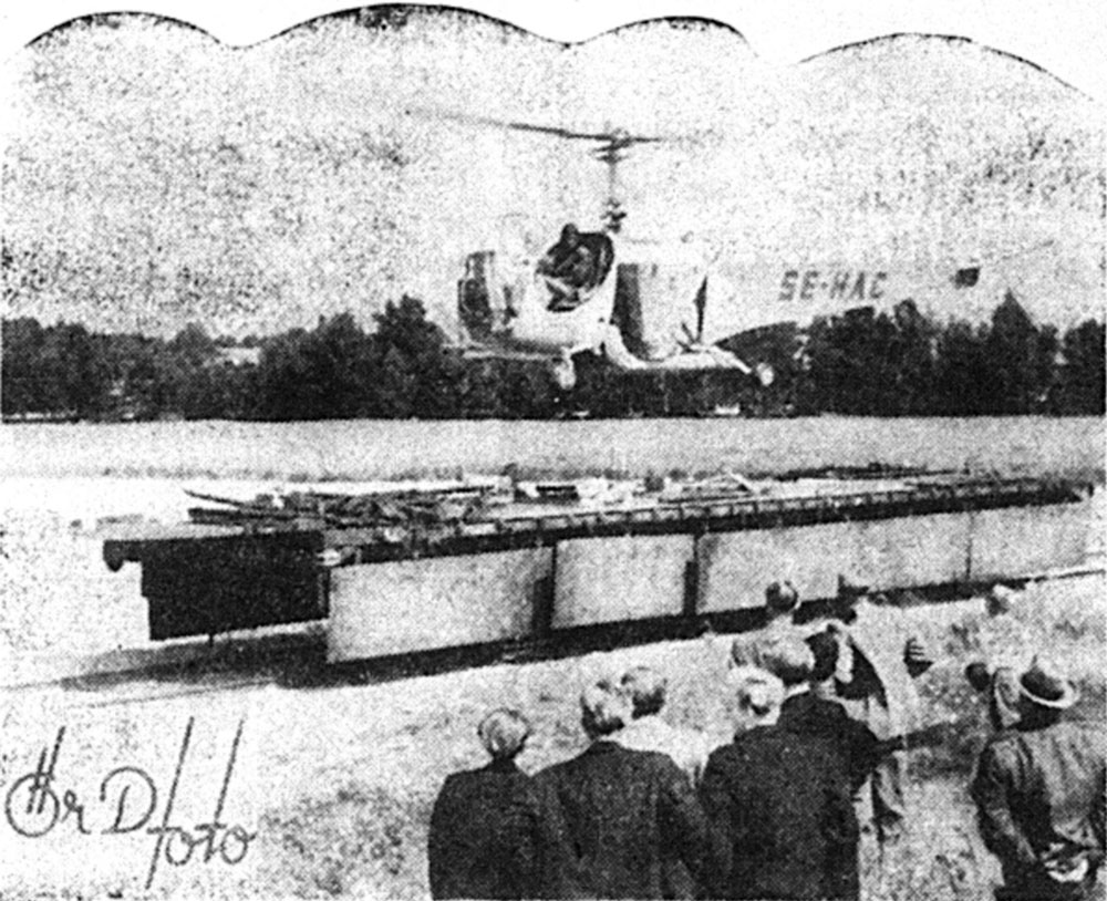 I lördags eftermiddag kunde man i Örebro bevittna något så ovanligt som en flygplansstart direkt från en järnvägsvagn. Det var hr Sune Wallman som lyfte med den helikopter som skulle medverka under söndagens flygdag. Flygning med helikopter är ingen billig historia. Genom att frakta den till Örebro med SJ istället för att flyga hela vägen, kunde transportkostnaderna minskas till en tiondel. Helikoptern fraktades på en vanlig öppen godsvagn som från Centralen fördes ut till en ledningsfri banstump vid Industriområdet.. Där lyfte helikoptern lekande lätt, svävade några meter över vagnen, gick ner bredvid för att plocka upp chefsinstruktören vid segelflyget, fanjunkare Bengt C-son Bergman, och styrde sedan mot flygfältet. I söndags kväll flögs helikoptern tillbaka till järnvägsvagnen där den gjorde en elegant landning för vidare färd till Malmö. (Originalartikeln var osignerad) |