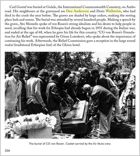 Mejl från en läsareVi fick nyss ett trevligt mejl från Claes Widén och en liten mejldialog utspann sig som kan sammanfattas ungefär så här: "Hej, Jag har nyligen varit i Addis Abeba och där besökt kyrkogården i Gullele. Syftet med besöket var att försöka hitta C G von Rosens grav. Det lyckades och väl där hittade jag två svenska gravar till, Dan Anderssons och Doris Wallströms. Jag skickar med bilder på gravarna ifall det finns intresse att lägga in dem på er webbplats. Ni har ju en text som bl.a. nämner Dan Anderssons insats i Etiopien och hans bortgång där. Jag har själv tagit bilden av C G von Rosens grav, övriga är tagna av kyrkogårdsvaktmästaren på Gullele Cemetery i Addis Abeba. På kyrkogårdsvaktmästarens fråga om det finns ett behov av att ”fräscha upp” texten på respektive gravsten från sade jag ”Ja”. Gravlocken är därmed numera tvättade och ny, vit text är ilagd på respektive sten så att det håller sig synligt och läsbart ett par år till." |
