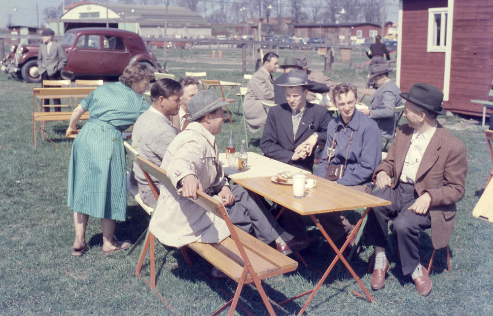 Rolf Broberg: Fikande gäster, troligen klubbmedlemmar eller möjligen bekanta till Arne Tengler på annat sätt. De sitter vid sydväggen på det hus som är servering och klubblokal. Minigolfbanan syns i bakgrunden. |