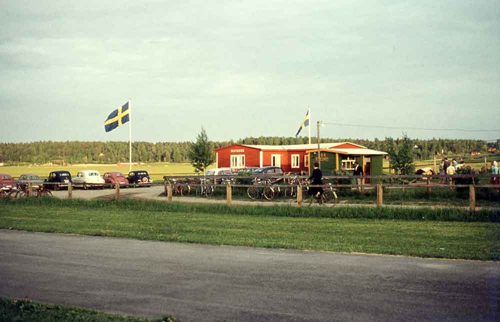 Rolf Broberg: Närmast går taxibanan från hangaren ut mot fältet. Bakom staketet är vägs ände med minigolf och servering. Klubblokalen är inrymd i samma röda byggnad som serveringen. |