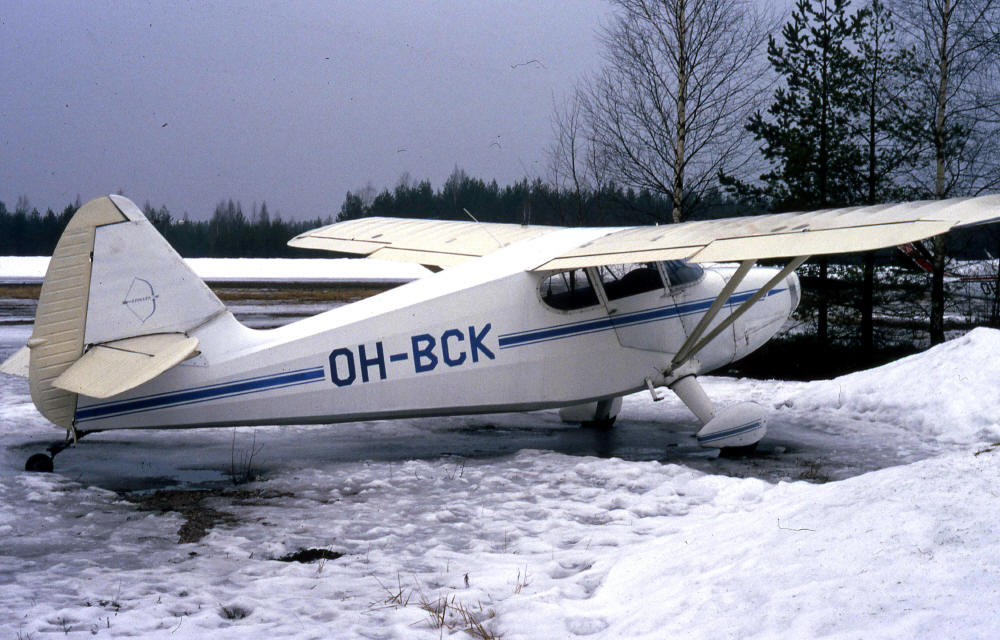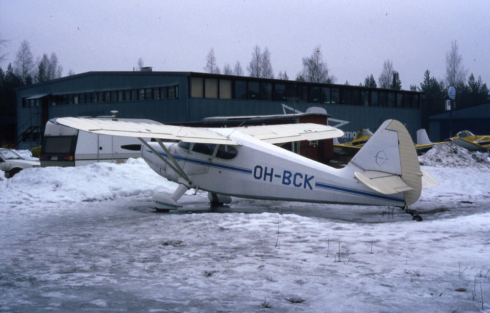 Arnes Stinson säljs till FinlandRolf Broberg: Arne Tengler sålde sin Stinson SE-BCK till Finland 1985. Den avregistrerades som SE-BCK 20 aug 1985 och blev istället OH-BCK. På grund av snön gissar jag att Arne varit på besök hos köparen efter försäljningen och tagit dessa bilder. |