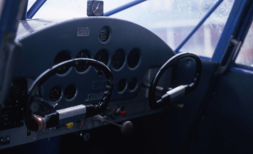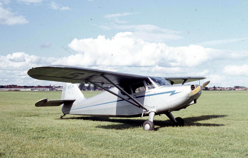 Rolf Broberg: Arne Tenglers Stinson SE-BCK sedd från serveringen. Framför fenan och under klaffen anas Ekängs kedjehusområde som jag tror byggdes ungefär 1959. |